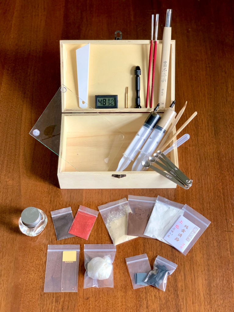 金継ぎを行うには、漆、金粉を始めとして、少なくとも30種類以上の素材と道具を必要とします。
