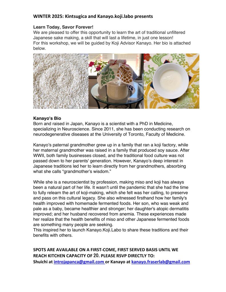 Sake Making Workshop Please register using the form at the bottom of the page.Price: $150 Go backYour message has been sent Name(required) Warning Email(required) Warning Phone(required) Warning Address (just area is ok)(required) Warning Message Warning Warning. Contact UsSubmitting form Δ Share this: Click to share on X (Opens in new window) X Click to share on Facebook (Opens in new window) Facebook Like Loading...